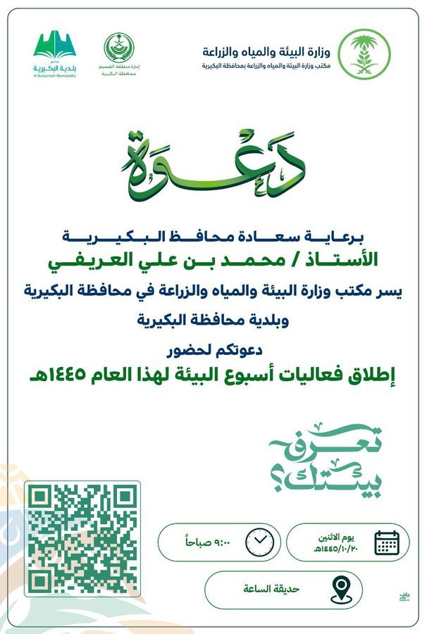 برعاية محافظ البكيرية الأستاذ محمد العريفي تنطلق فعاليات أسبوع البيئة لهذا العام ۱٤٤٥ هـ تحت شعار ” تعرف بيئتك “. وذلك في حديقة الساعة يوم الاثنين 1445/10/20 التاسعة صباحا وبأشراف مكتب وزارة البيئة والمياه والزراعة بالمحافظة و بلدية البكيرية