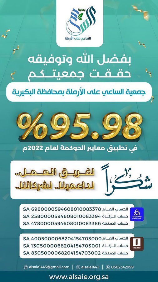 حققت جمعية الساعي على الأرملة في محافظة البكيرية نجاحًا باهرًا في تطبيق معايير الحوكمة، حيث وصلت نسبة الإنجاز إلى 95.98%. هذا النجاح لم يكن وليد صدفة، بل نتيجة جهد مستمر وتعاون مثمر بين الأعضاء والداعمين.